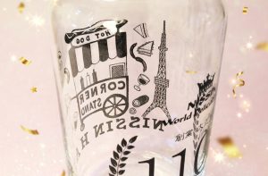 ▲110周年の刻印とオリジナルイラストがスタイリッシュに描かれた特製ビールグラス ¥900(税込)