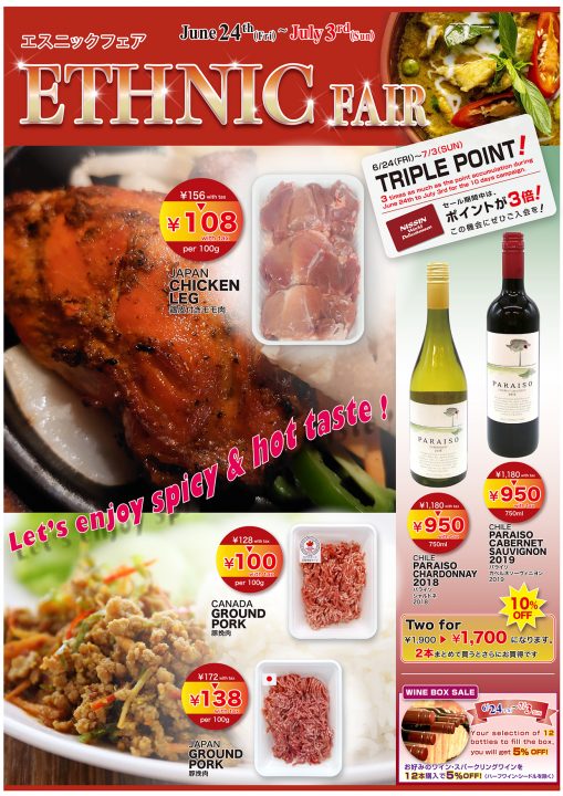 エスニックフェアのお知らせに掲載の鶏肉や豚肉、ソースなどを使って、ホットな風味をお楽しみください。