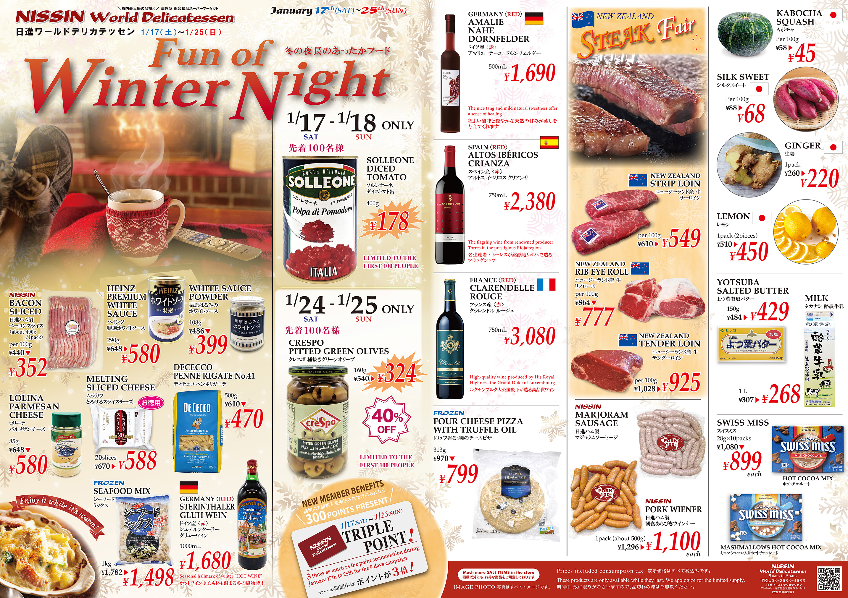 【ウィンターセール】FUN OF WINTER NIGHT 1/17(SAT)~1/25(SUN) SALE 2026-1-9 ツイート Enjoy it while it’s warm! 「FUN OF WINTER NIGHT」 冬の夜長のあったかフード特集 「ファン オブ ウィンターナイト」 期間:1/17(SAT)~1/25(SUN) ホットメニューにおすすめの食材を取り揃えました。 本イベント期間中はポイントが3倍になります。 ツイート