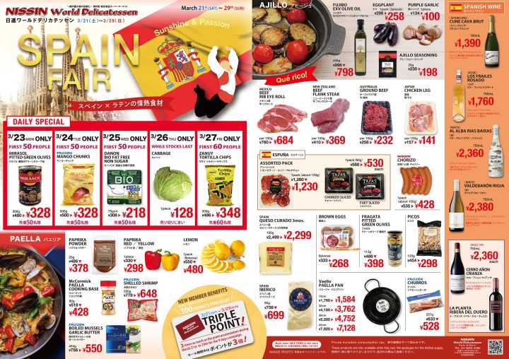 【スペインフェア】SPAIN FAIR 3/21(SAT)~3/29(SUN) SALE 2026-3-17 ツイート Sunshine & Passion 「SPAIN FAIR」 スペイン×ラテンの情熱食材特集 「スペインフェア」 期間:3/21(SAT)~3/29(SUN) ホット&スパイシーな風味を楽しめる食材を豊富に取り揃えました。 本イベント期間中はポイントが3倍になります。 ツイート