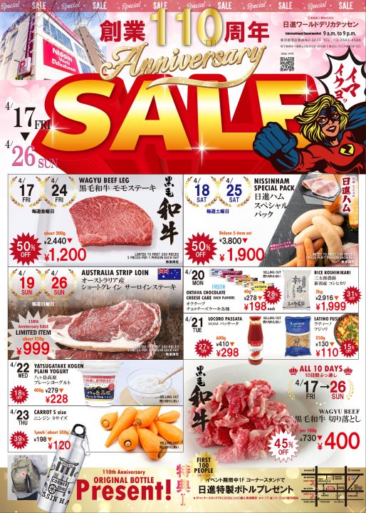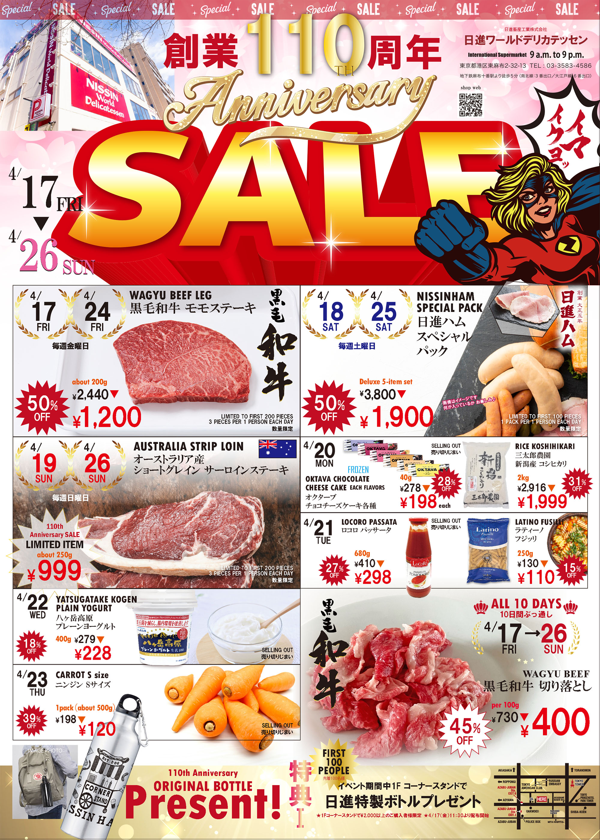 つきましては、これまでの感謝の気持ちをこめ、日進ワールドデリカテッセンでアニバーサリーセールを開催いたしますので、ぜひお立ち寄りくださいませ。